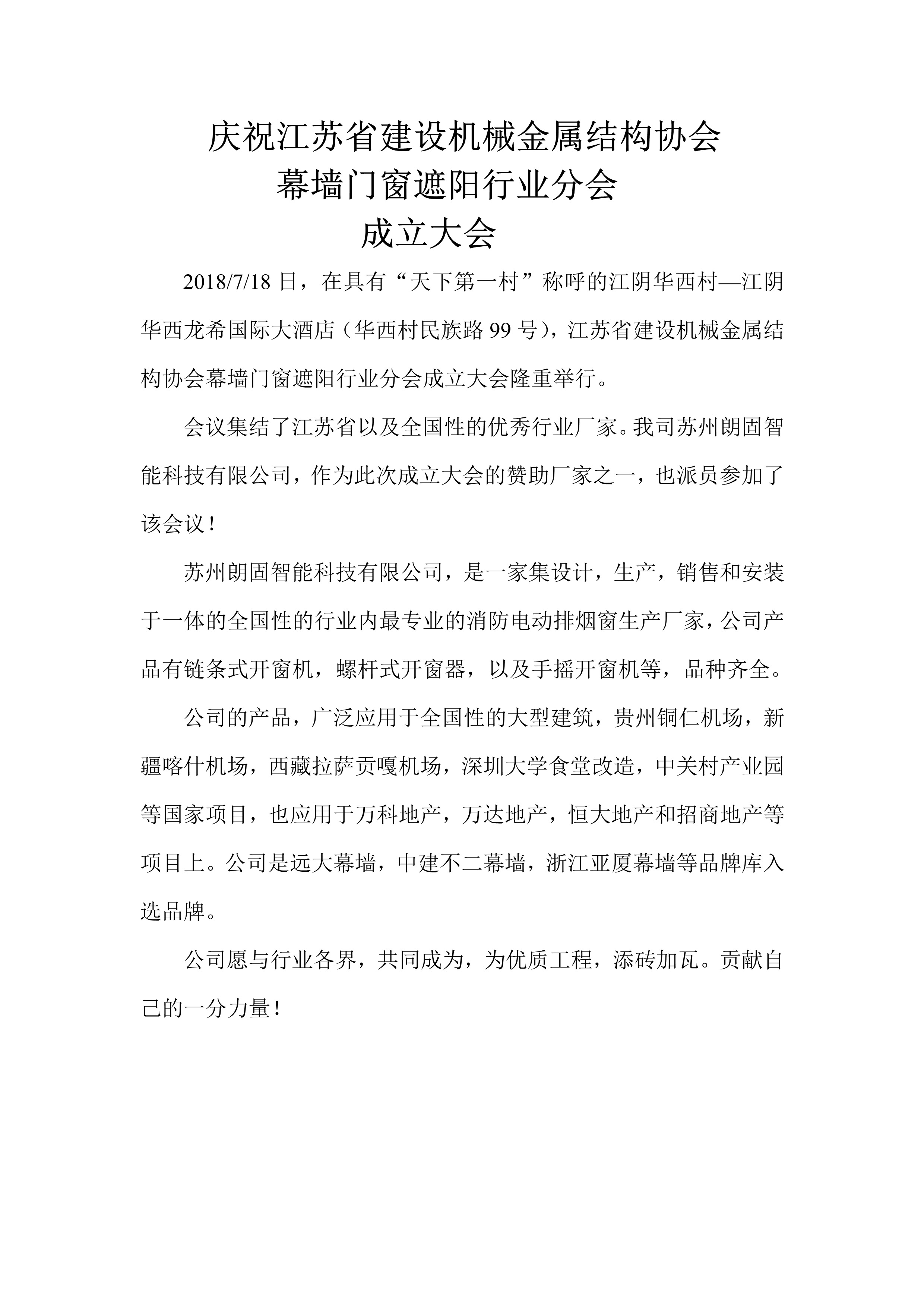 慶祝江蘇省建設(shè)機械金屬結(jié)構(gòu)協(xié)會幕墻門窗遮陽行業(yè)分會 成立大會